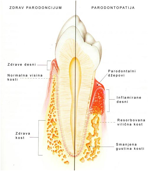 Пародонтопатия представляет собой воспалительный процесс, который захватывает десны, костную ткань альвеолы и другие органы так называемого опорного аппарата зуба. Она характеризуется воспалением десен (гингивит) и ослаблением зубодесневого соединения, резорбцией костной ткани, образованием пародонтальных карманов, а в запущеной форме – повышеной подвижностью зубов и окончательной потерей зуба.